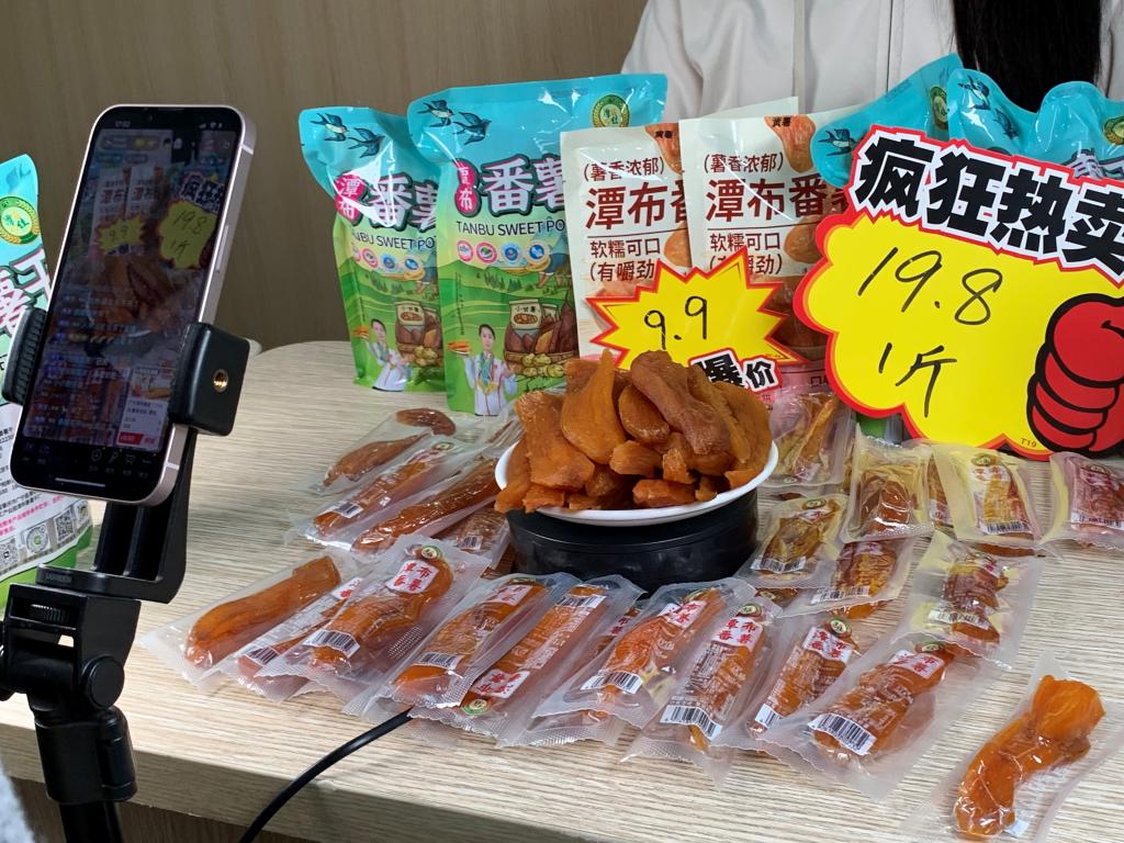 下午5点,直播组同学在工作人员的指导带领下开展了第一次长达一小时的预热直播。本次直播主要向受众介绍了肇庆市广宁县潭布镇特色农产品番薯干,观看人数达到218人次。